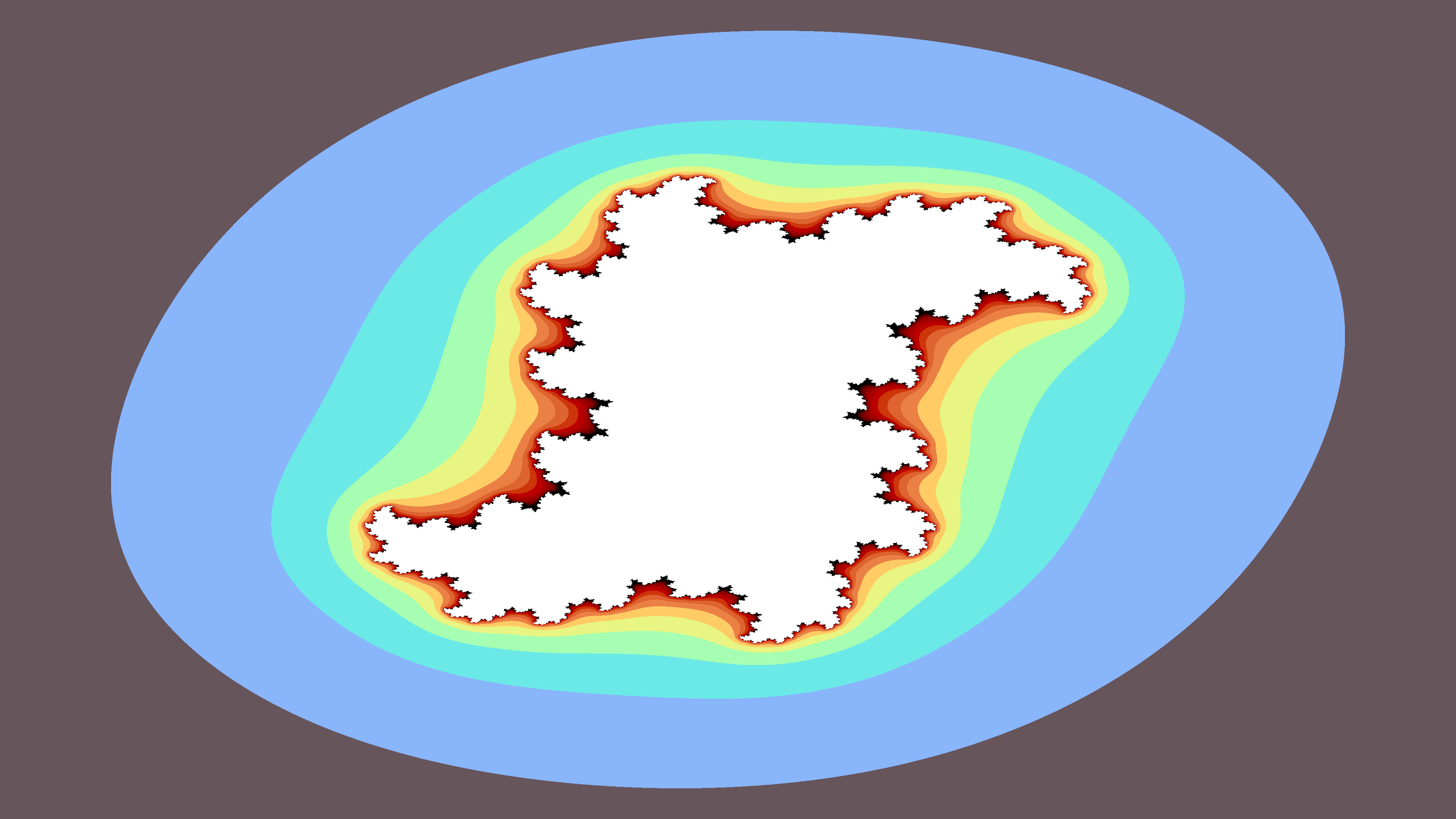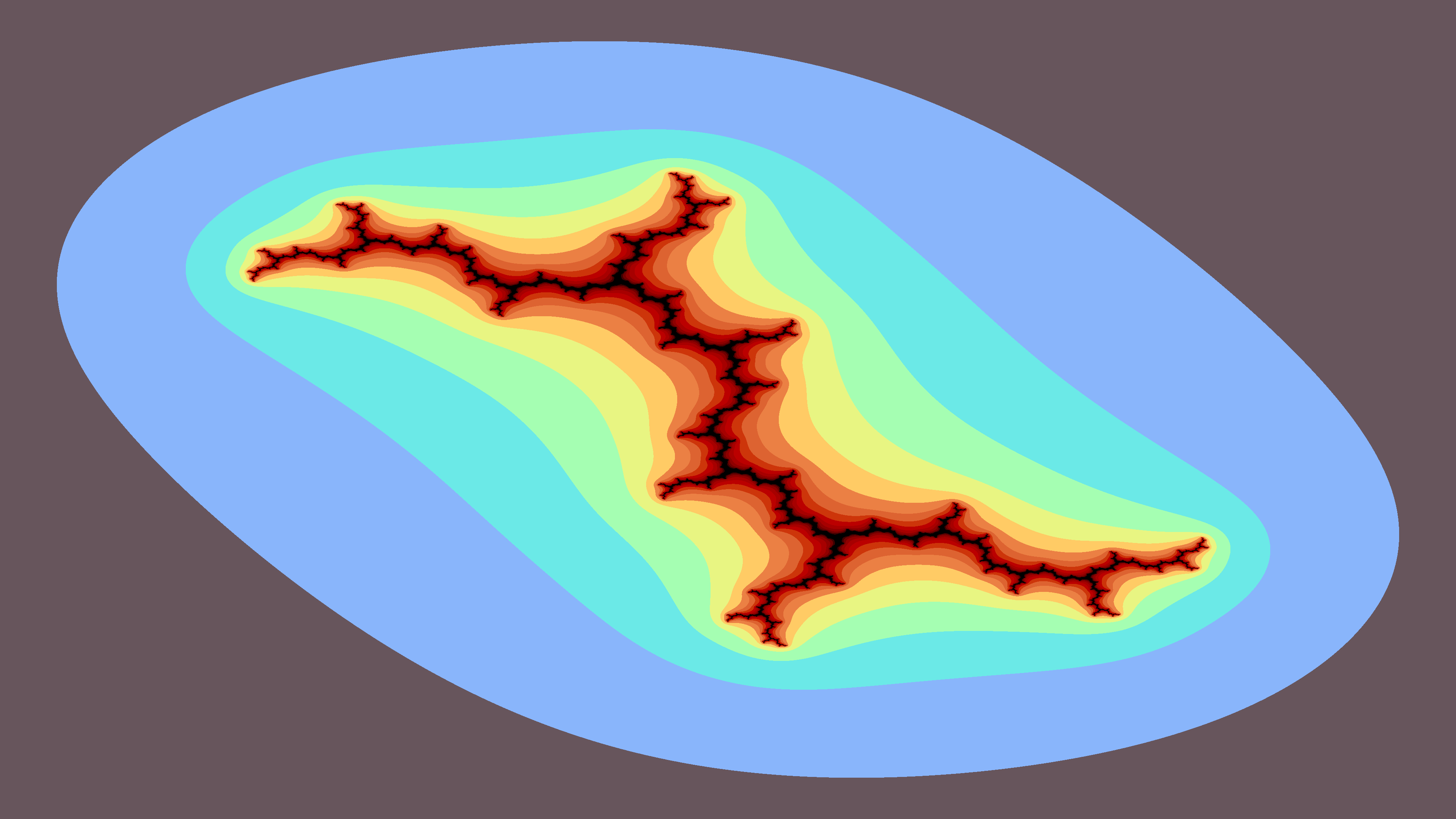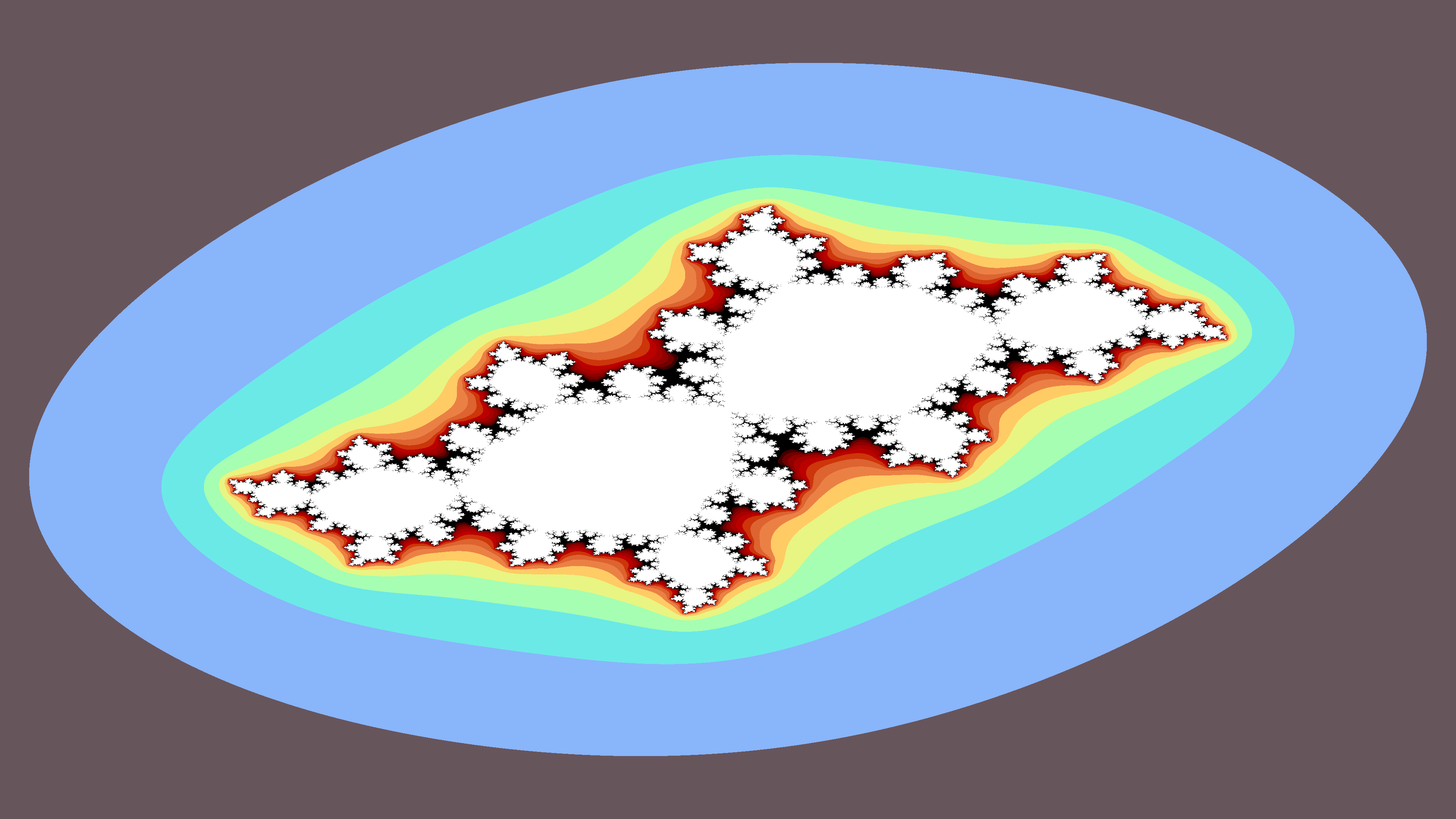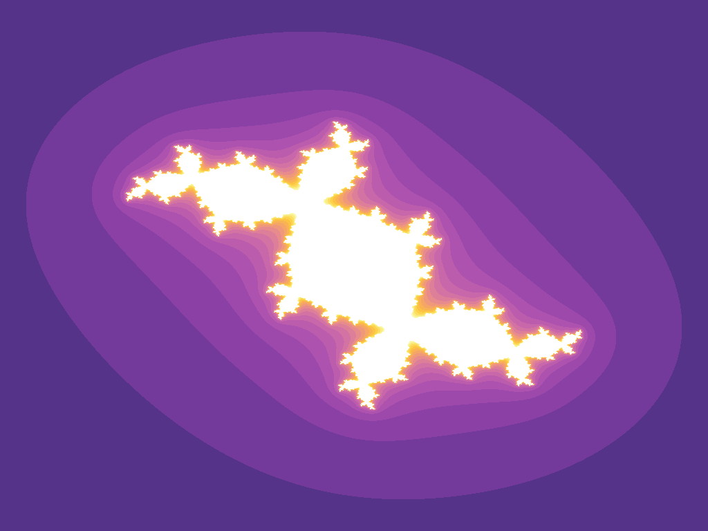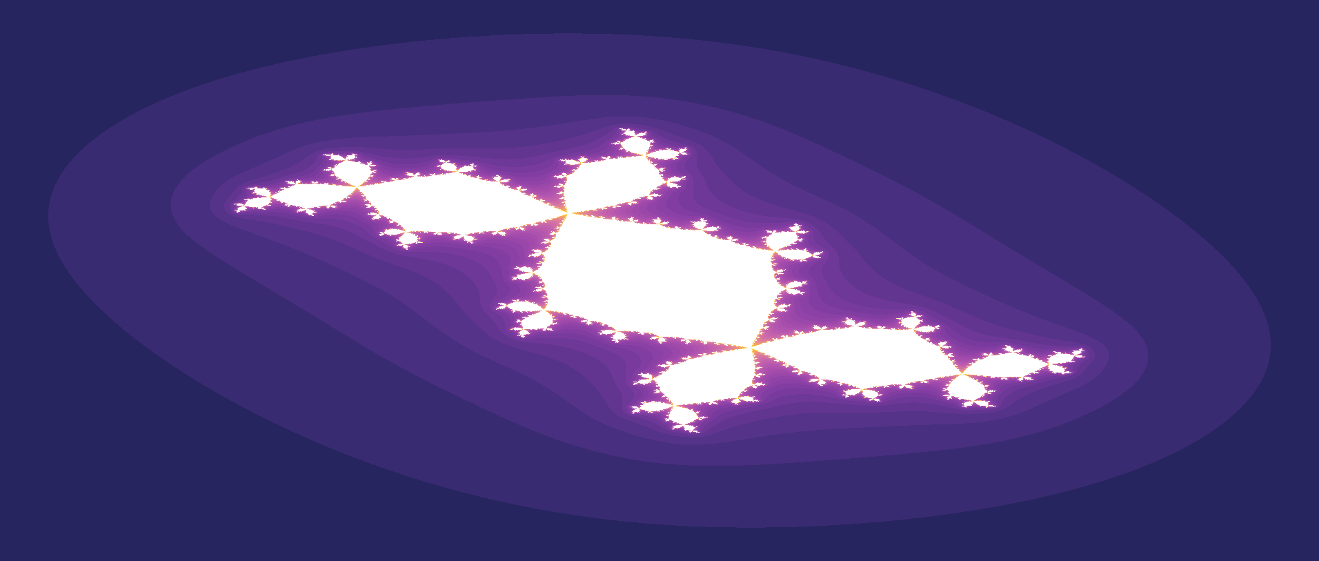 Note how the darker colors on the left are not used because the escape iteration count starts at 3Fig 2.8. Douady’s rabbit created using 50 iterationsFig 2.9. Inferno color scheme utilization (dashed box) for Douady’s rabbit with 50 iterationsFig 2.10. Douady’s rabbit created using 200 iterationsFig 2.11. Douady’s rabbit created using 800 iterationsFig 2.12. Douady’s rabbit created using 800 iterations with histogram coloringFig 2.13. A Siegel diskFig 2.14. A dragonFig 2.15. The Julia set of \(sin(z)\)Fig 2.17. The Mandelbrot Set