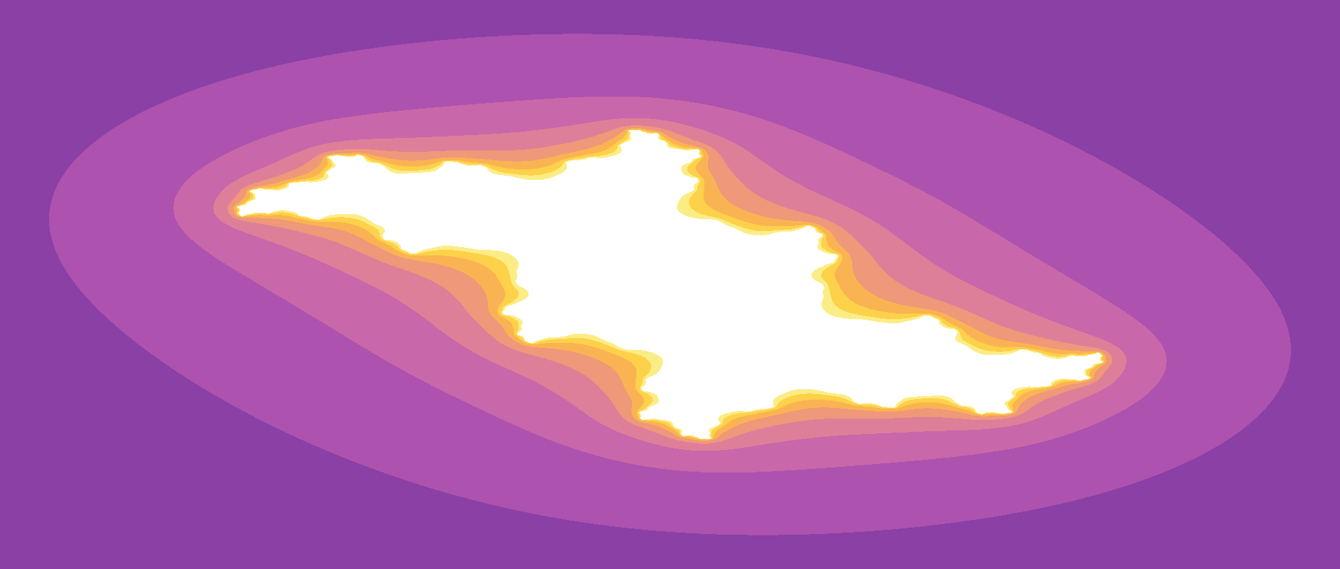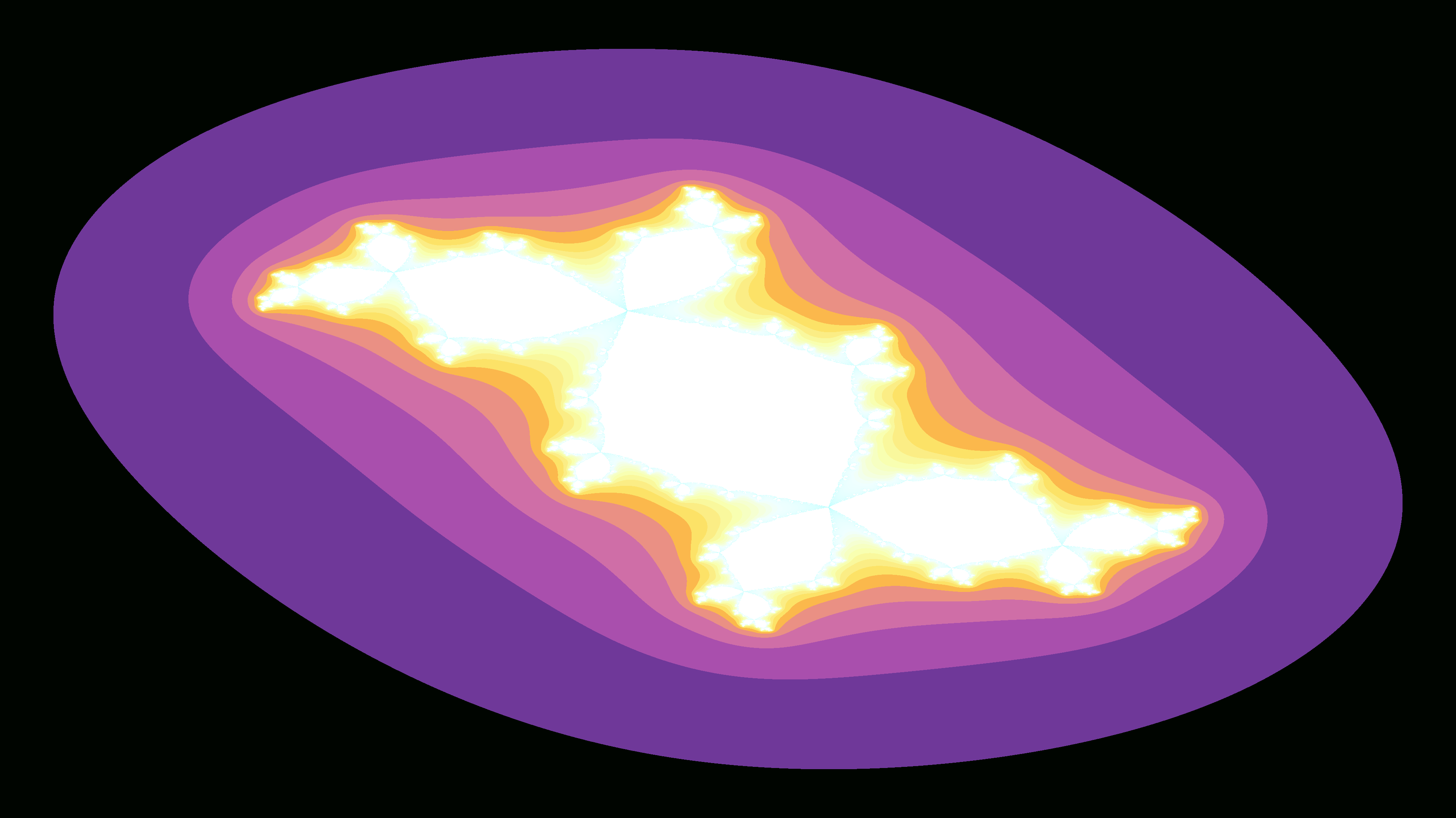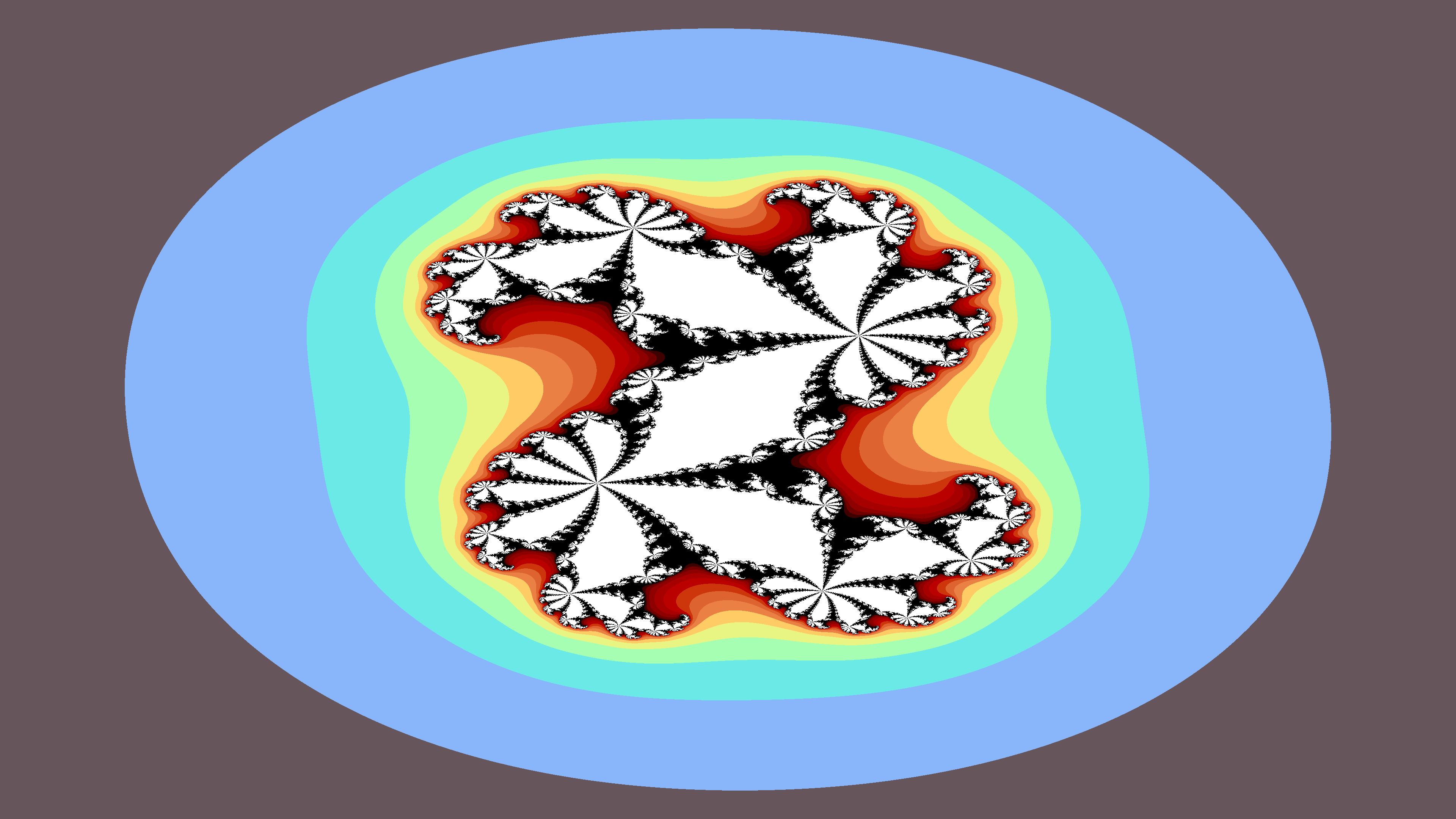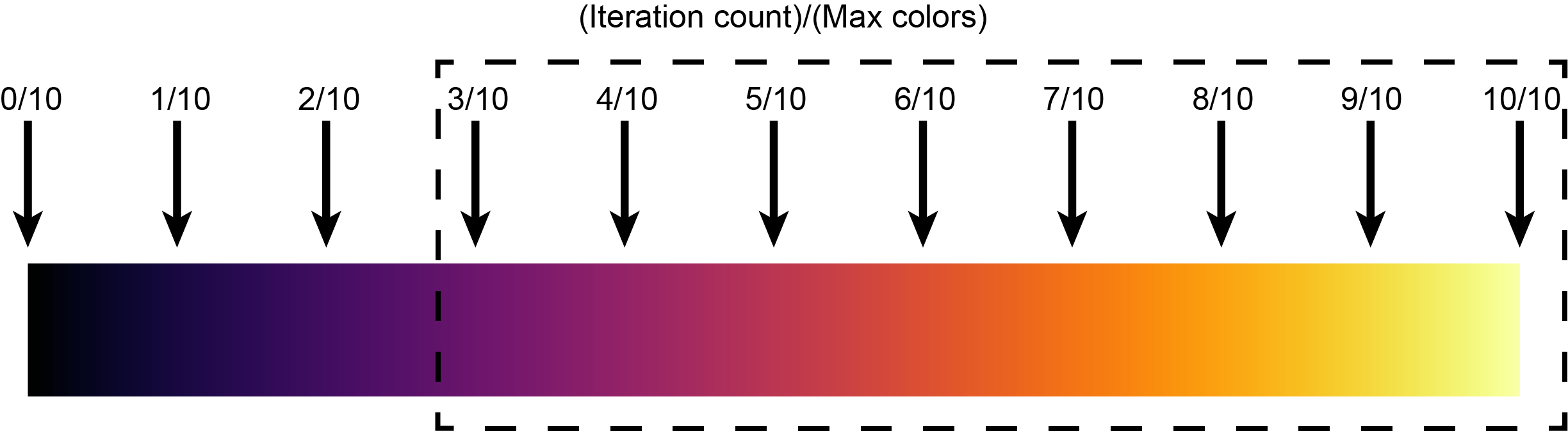 Note how the darker colors on the left are not used because the escape iteration count starts at 3Fig 2.8. Douady’s rabbit created using 50 iterationsFig 2.9. Inferno color scheme utilization (dashed box) for Douady’s rabbit with 50 iterationsFig 2.10. Douady’s rabbit created using 200 iterationsFig 2.11. Douady’s rabbit created using 800 iterationsFig 2.12. Douady’s rabbit created using 800 iterations with histogram coloringFig 2.13. A Siegel diskFig 2.14. A dragonFig 2.15. The Julia set of \(sin(z)\)Fig 2.17. The Mandelbrot Set
