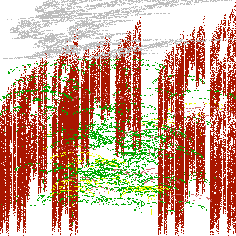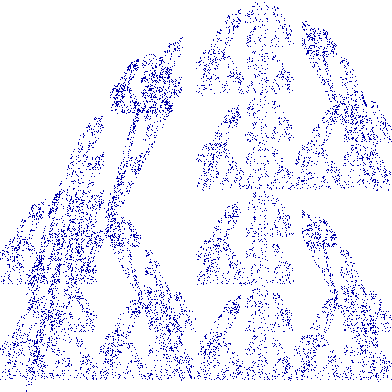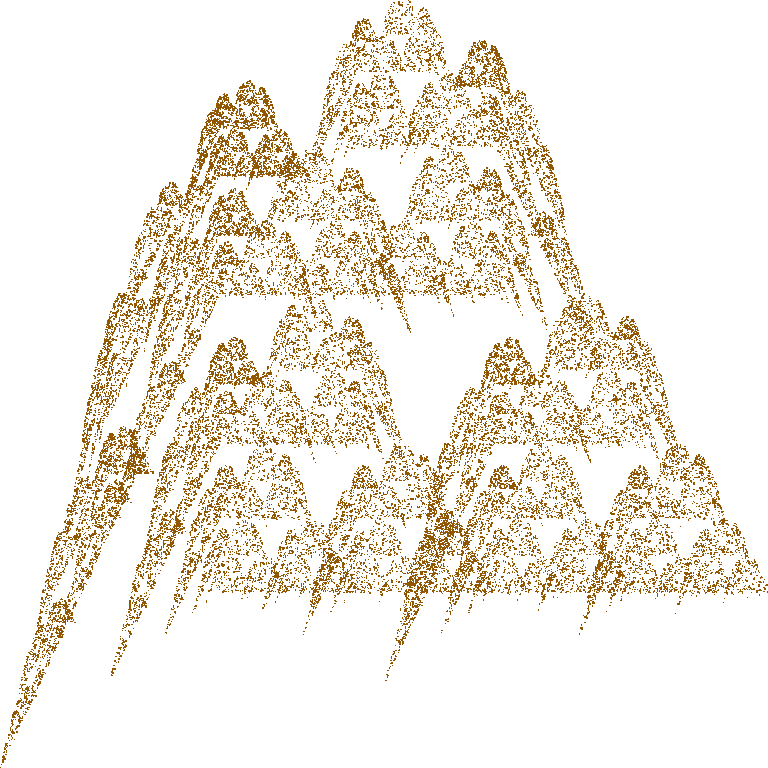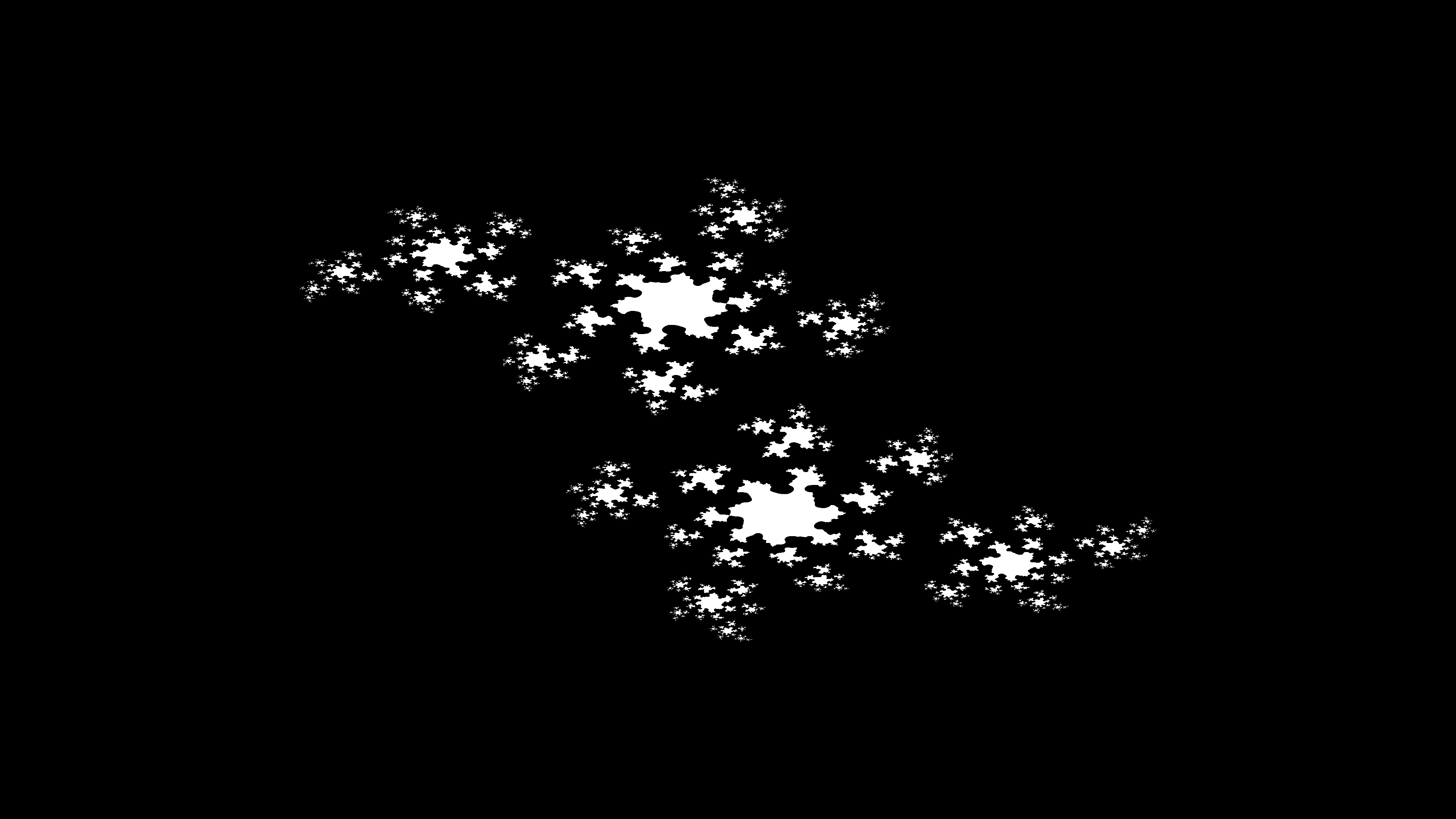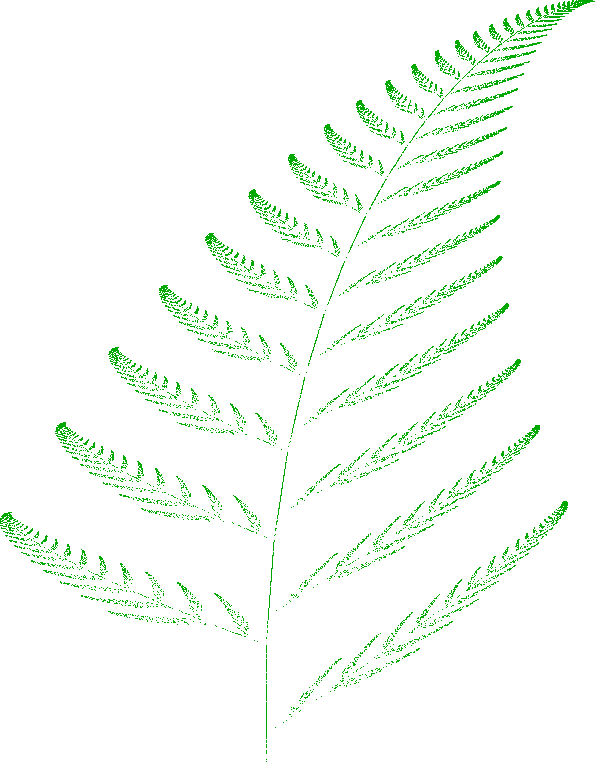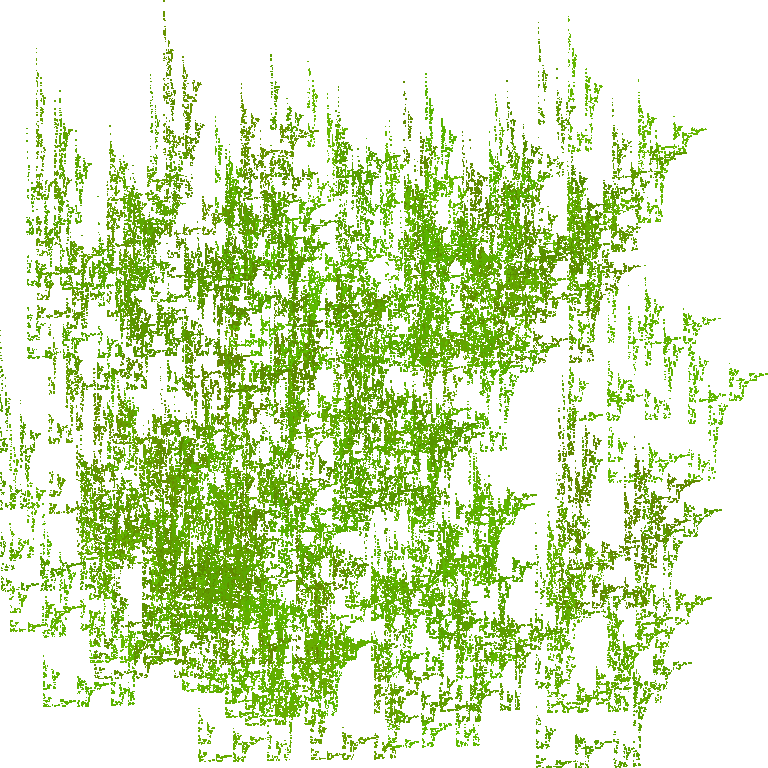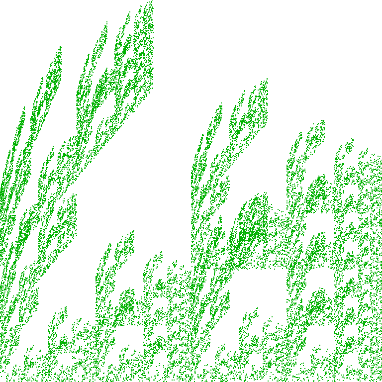 Julia set of \(f(z) = Z^2+ .3-4i\)Fig 3.6. A fern leafFig 3.7. A fern leaf generated via IFSFig 3.8. IFS Representation of a treeFig 3.9. A forest of randomly generated fractal treesFig 3.10. A redwood forestFig 3.11. Green seaweedFig 3.12. Four-petaled flower from the Julia set of \(f(z) = z^2+0.384\)Fig 3.13. Another four-petaled flower from the Julia set of \(f(z) = z^2+0.2541\)Fig 3.14. A fractal storm cloudFig 3.15. "Three-dimensional" fractal cloudsFig 3.16. Fractal rocks using same IFS codes as the cloudsFig 3.17. Snowflakes generated by mandel_julia.rsFig 3.18. A snow fall generated by fall.rsFig 3.20. A randomly generated view of spaceFig 3.22. Dendrite structure generated by \(f(z) =z^2 + i\)Fig 3.23. An EKG output simulated using a Julia set